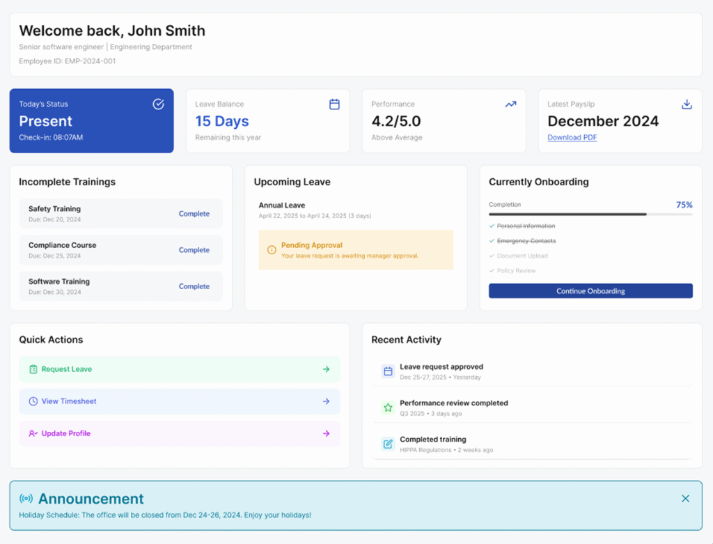 Empower your team with self-service access to their profiles, payslips, and leave requests. The portal reduces HR workload while giving employees transparency and control over their own information.